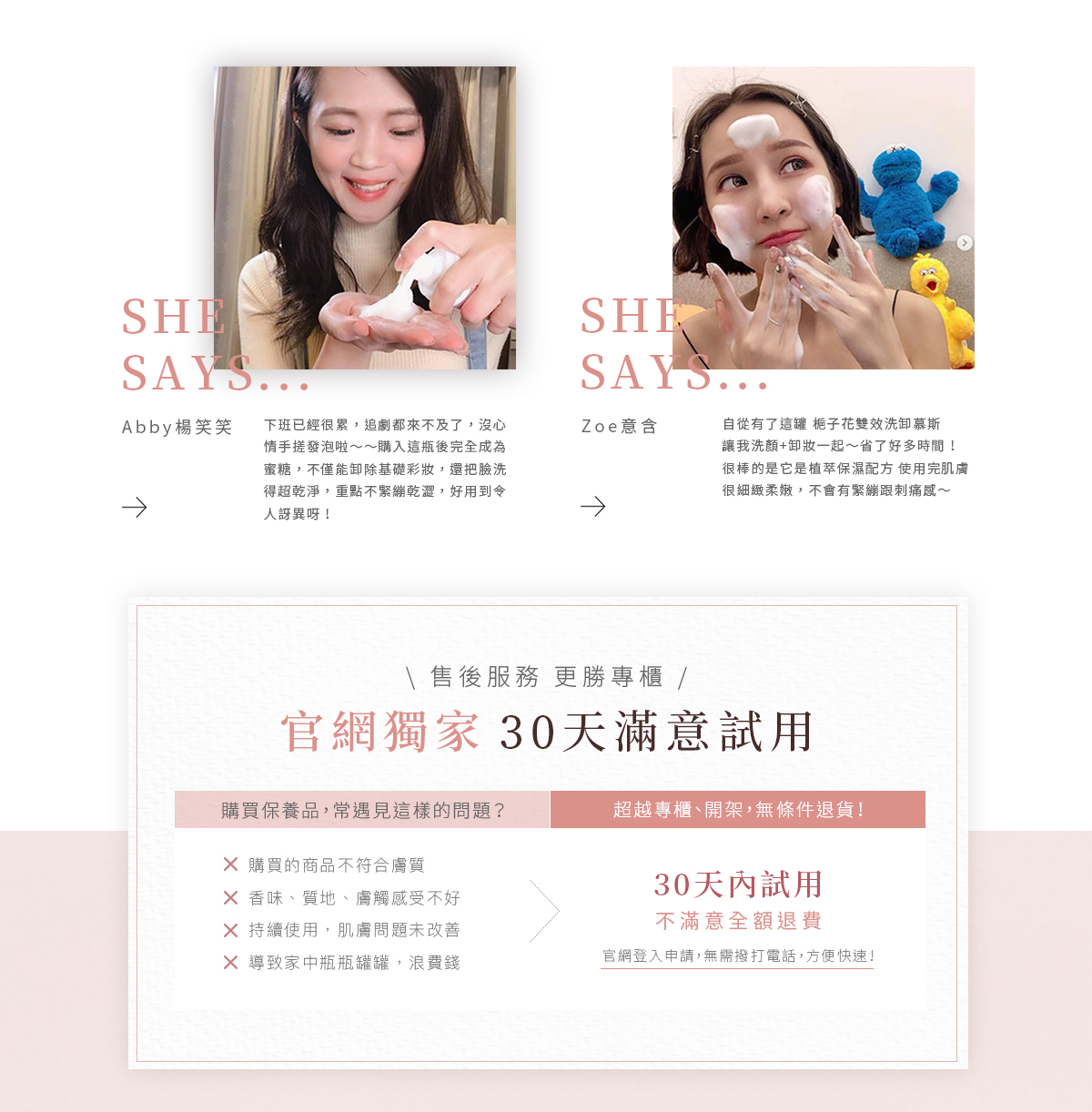 洗臉、卸妝雙效洗顏慕斯,擁有超綿密泡泡,快速滲透溶解底妝。含4大保濕潔淨配方「25%胺基酸」、「梔子花+8種草本萃取」、「維他命原B5」、「繖花醇」,溫和洗淨不易造成敏感刺激,深層舒緩、保濕、改善粗糙,預防毛孔阻塞及肌膚問題。 ◎使用方法: 按壓約2-3次的泡沫置於掌心,輕柔按摩於濕潤的臉部,再以清水洗淨。 內容物:梔子花雙效洗卸慕斯150ml x2